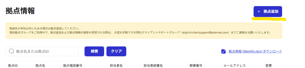 本社以外に拠点への発送希望の場合は、下記より拠点追加をすることが可能です。