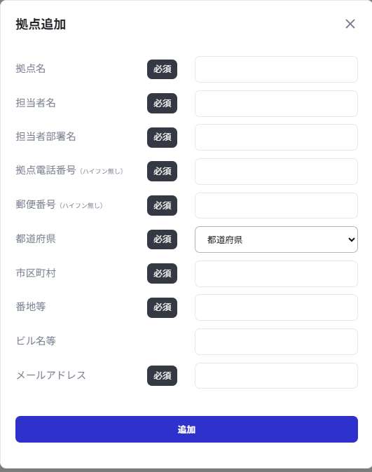 右上の +拠点追加 より 拠点情報をご登録ください。※ご入力箇所は全て必須項目となります。